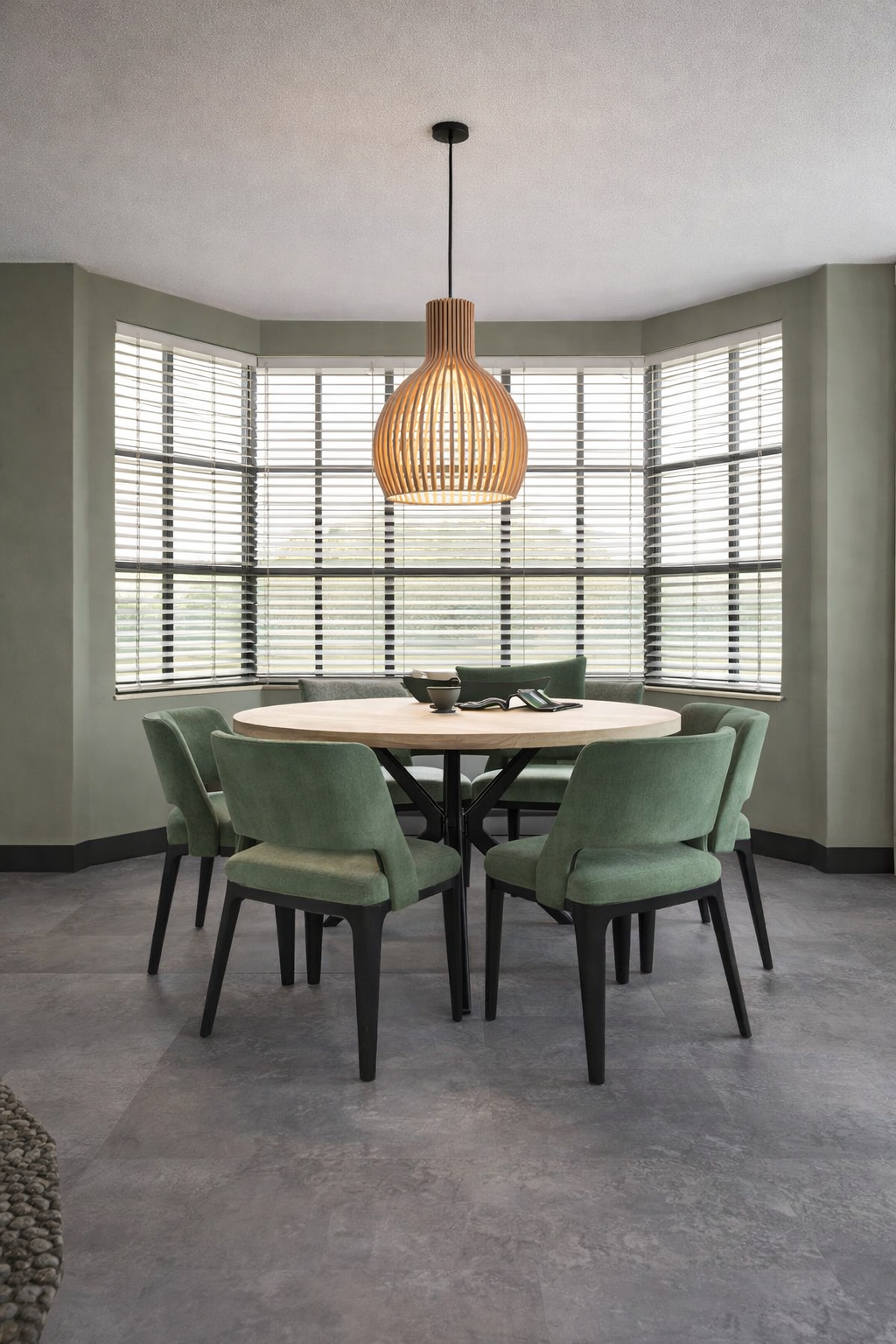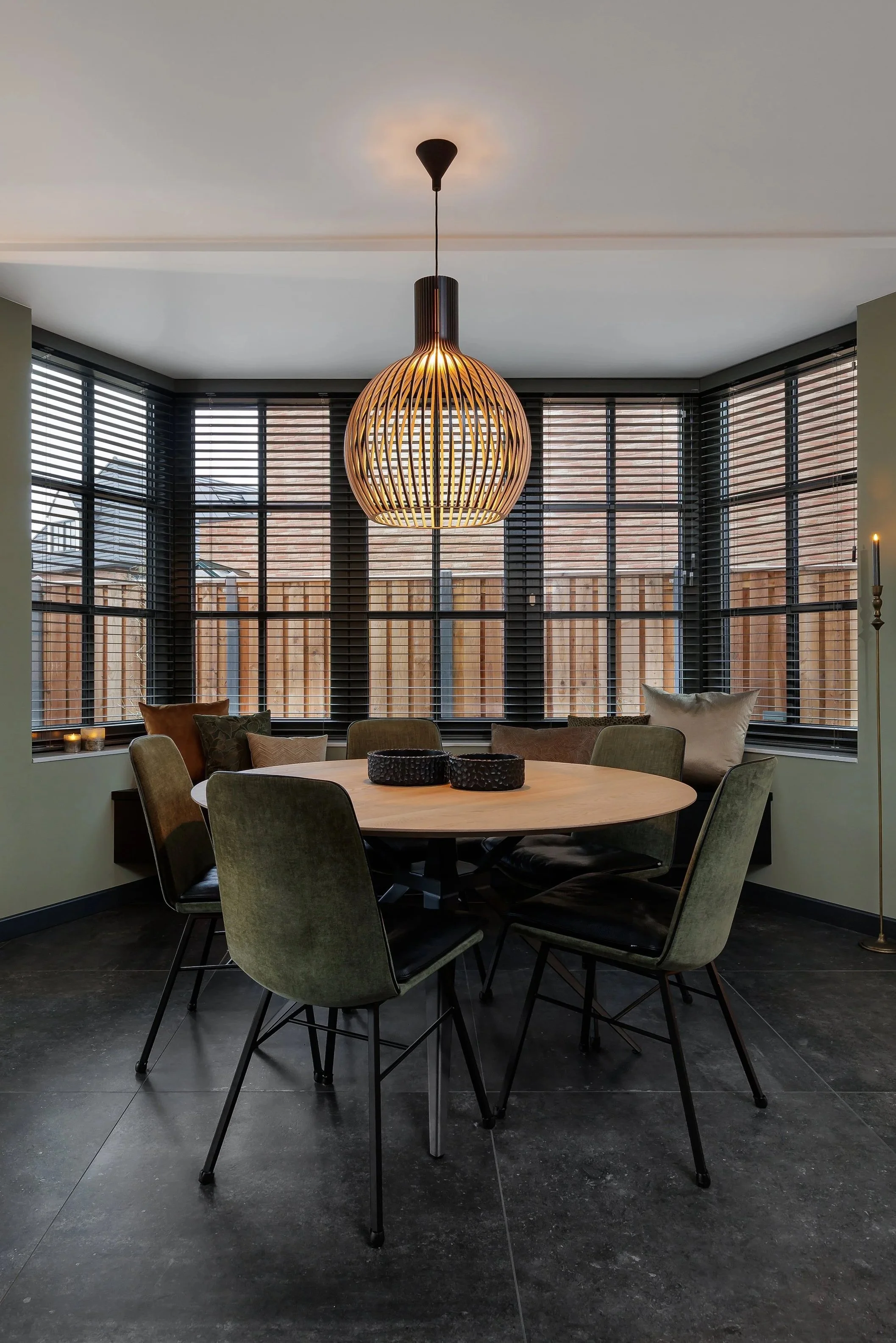 De eethoek hebben we in de erker geplaatst. Hierdoor past er een grote ronde eettafel. De houten jaloezieën zorgen ervoor dat je goed kunt spelen met de lichtinval en de transparante hanglamp houdt het geheel luchtig. In de erker hebben we een bankje met opbergruimte op maat laten maken.