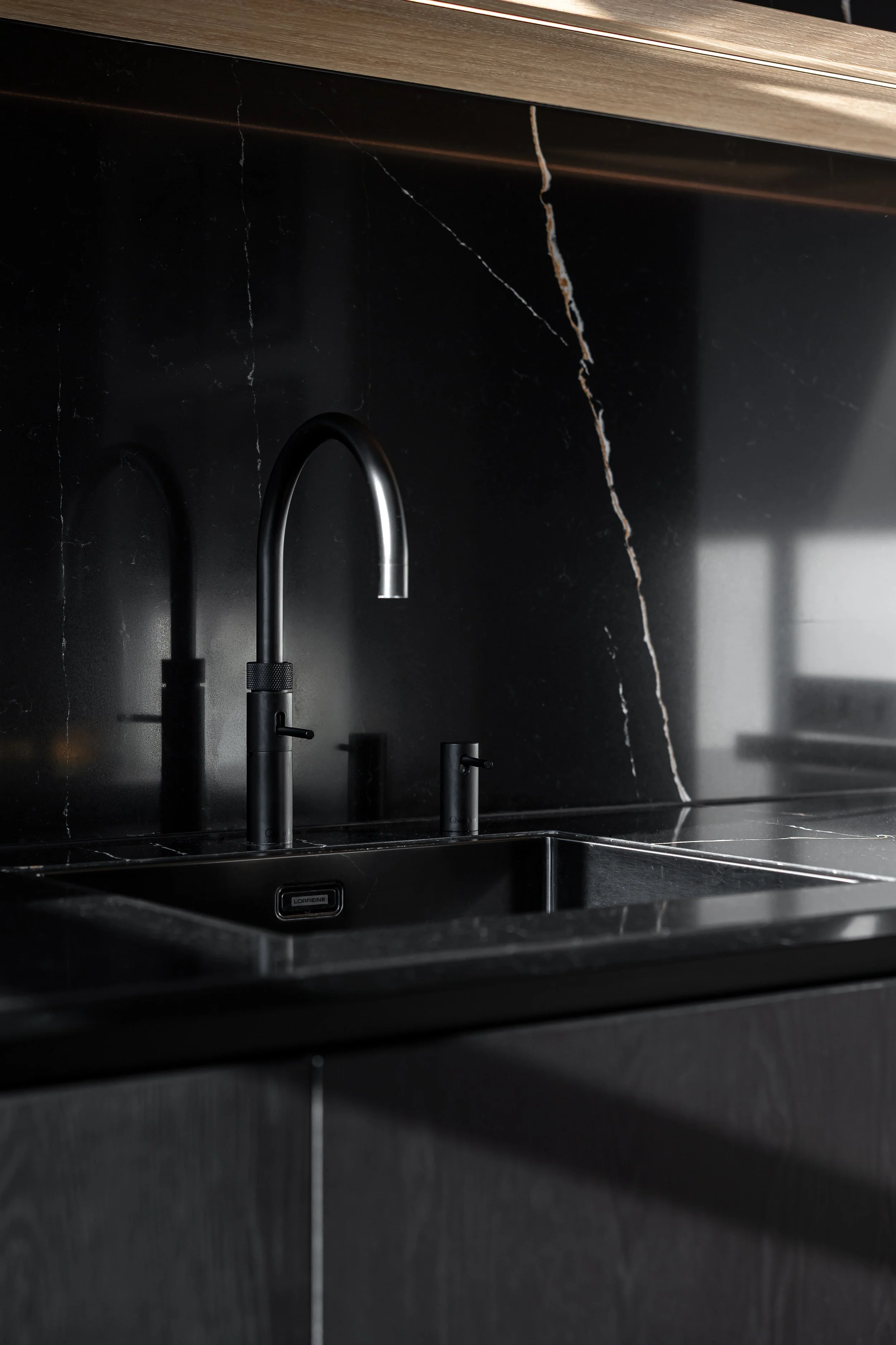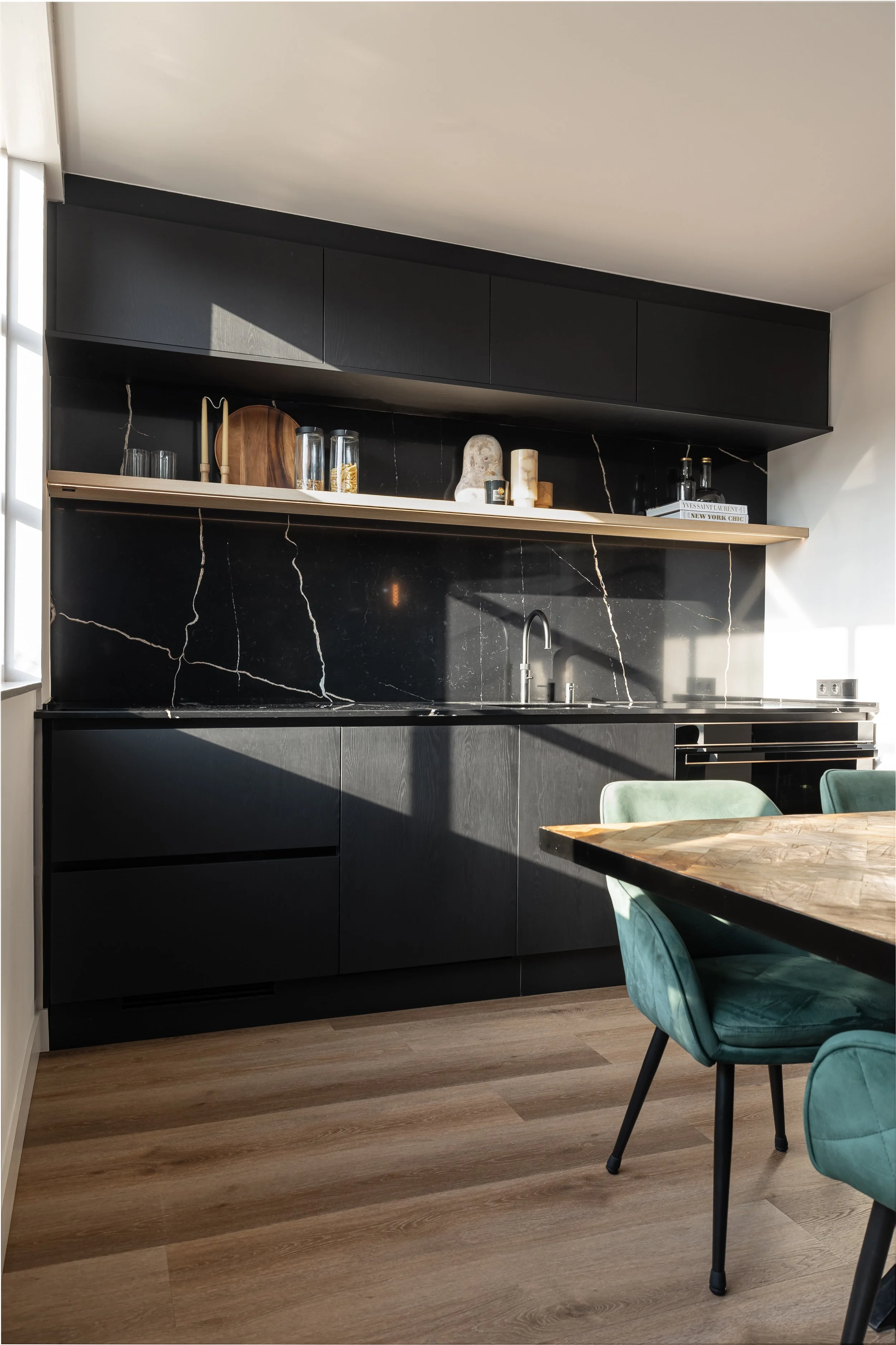 Voor deze keuken hebben we de beschikbare ruimte zo optimaal mogelijk benut, zodat er voldoende opbergruimte ontstaat, zonder dat de ruimte zwaar aanvoelt. Door te werken met verschillende materialen en subtiele ledverlichting blijft het geheel ruimtelijk ogen, ondanks de keuze voor donkere materialen. Zo ontstaat een praktische en sfeervolle leefkeuken.