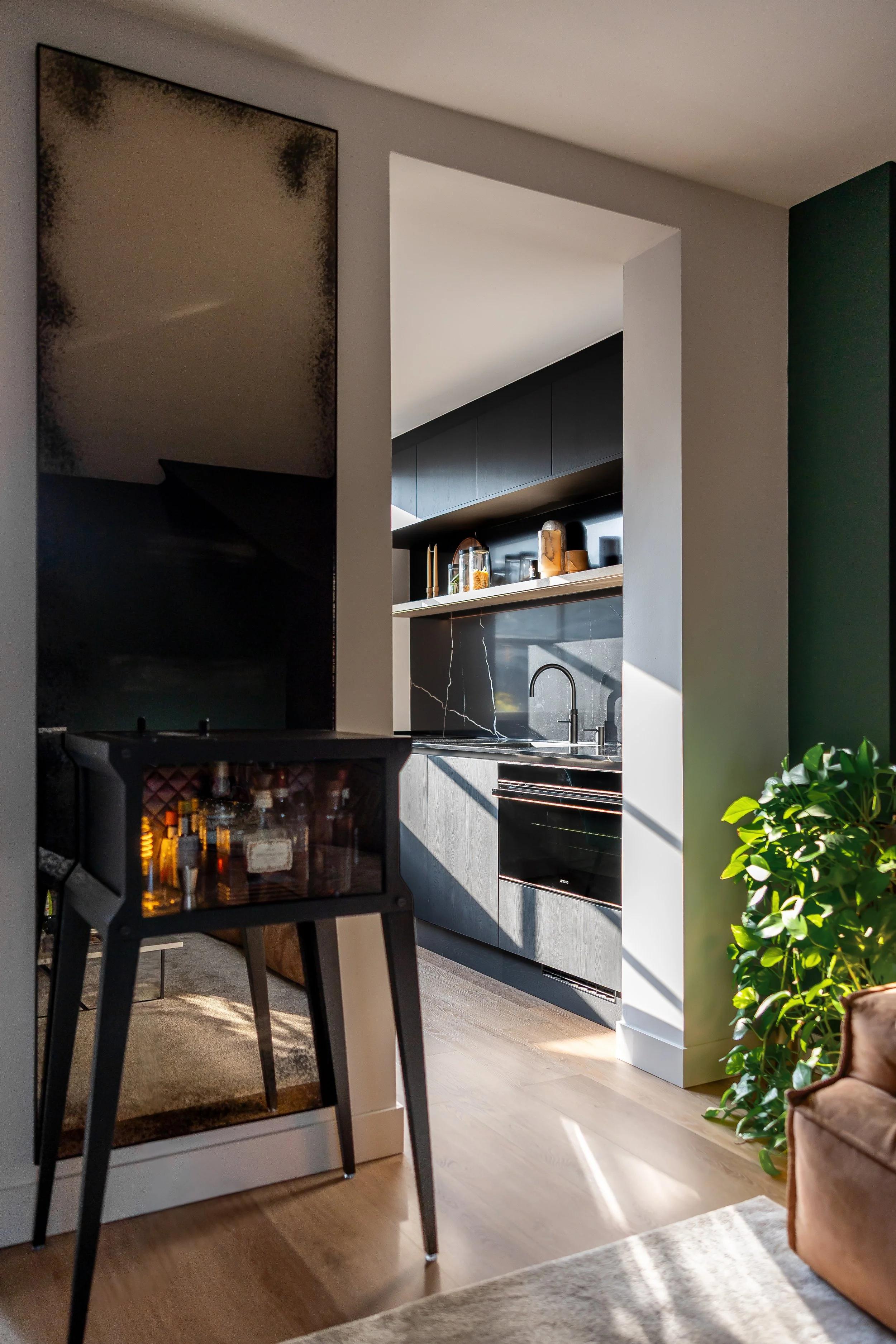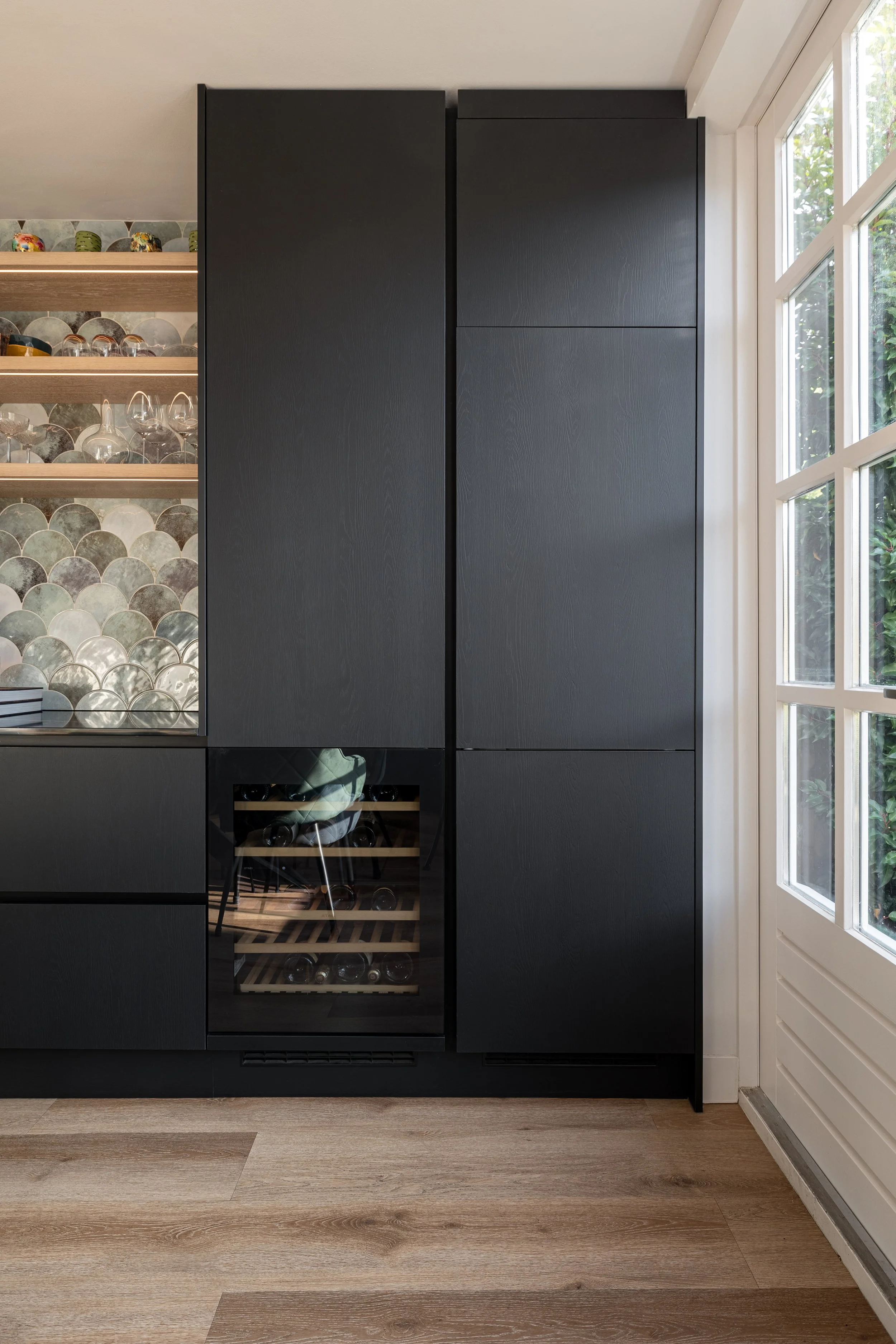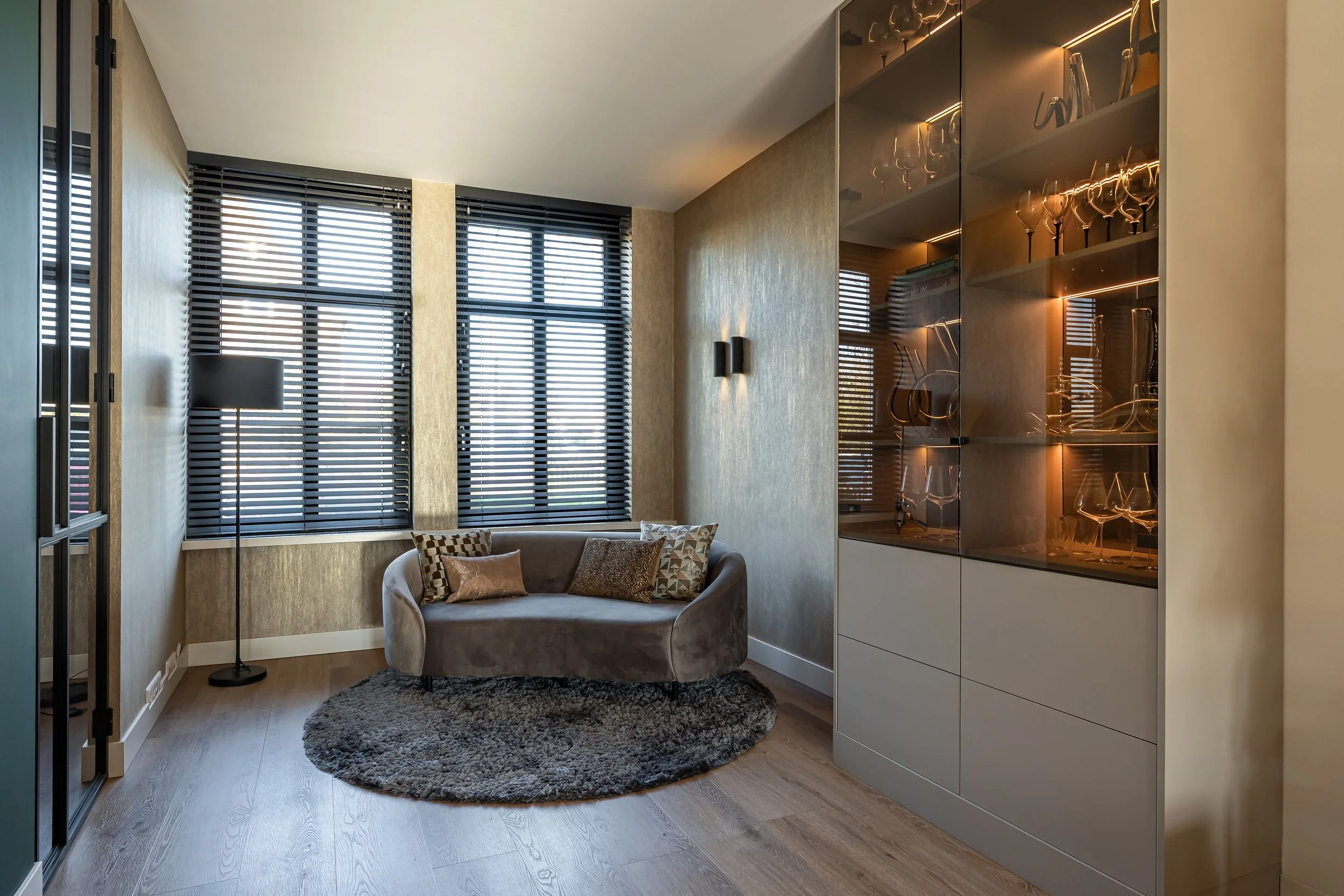 Voor het tweede deel van de woonkamer hebben we een maatwerkkast ontworpen die perfect aansluit bij de ruimte. De kast is speciaal gemaakt om de exclusieve collectie wijnglazen en karaffen van de bewoner op een stijlvolle manier te presenteren, terwijl er tegelijkertijd praktische opbergruimte ontstaat.