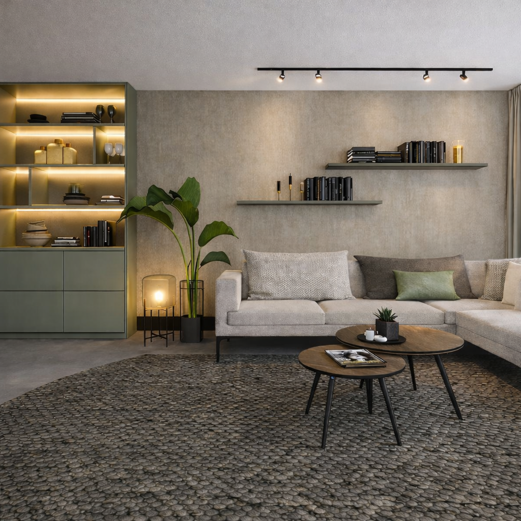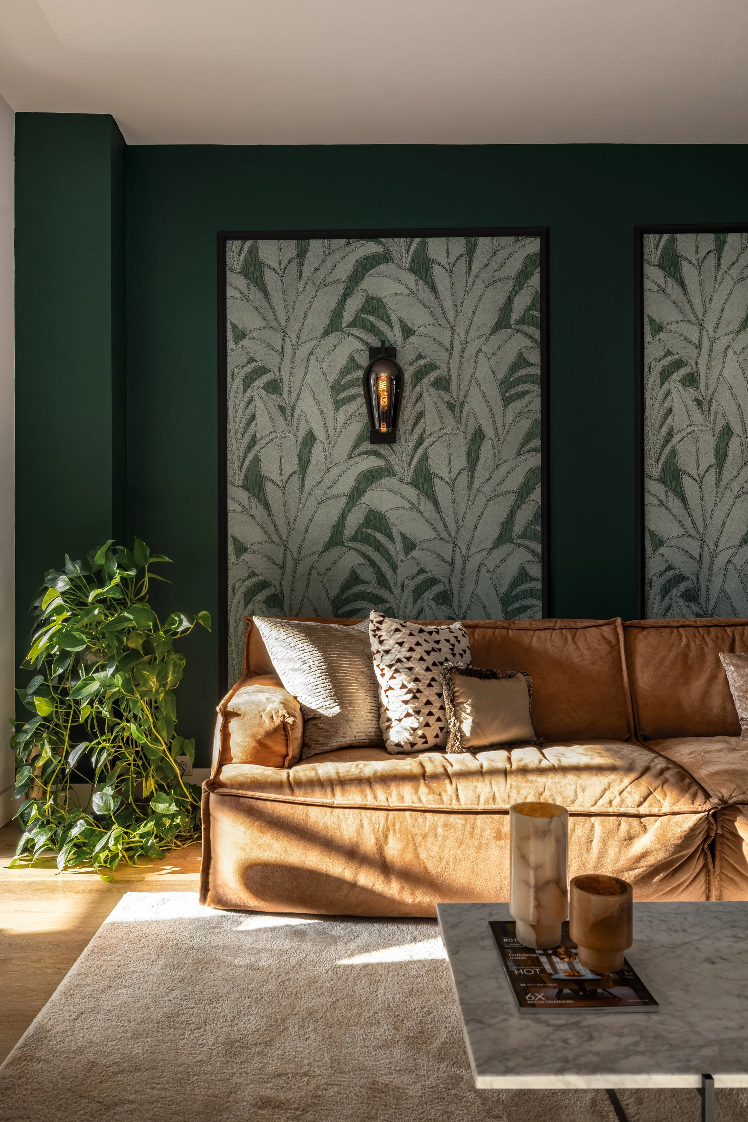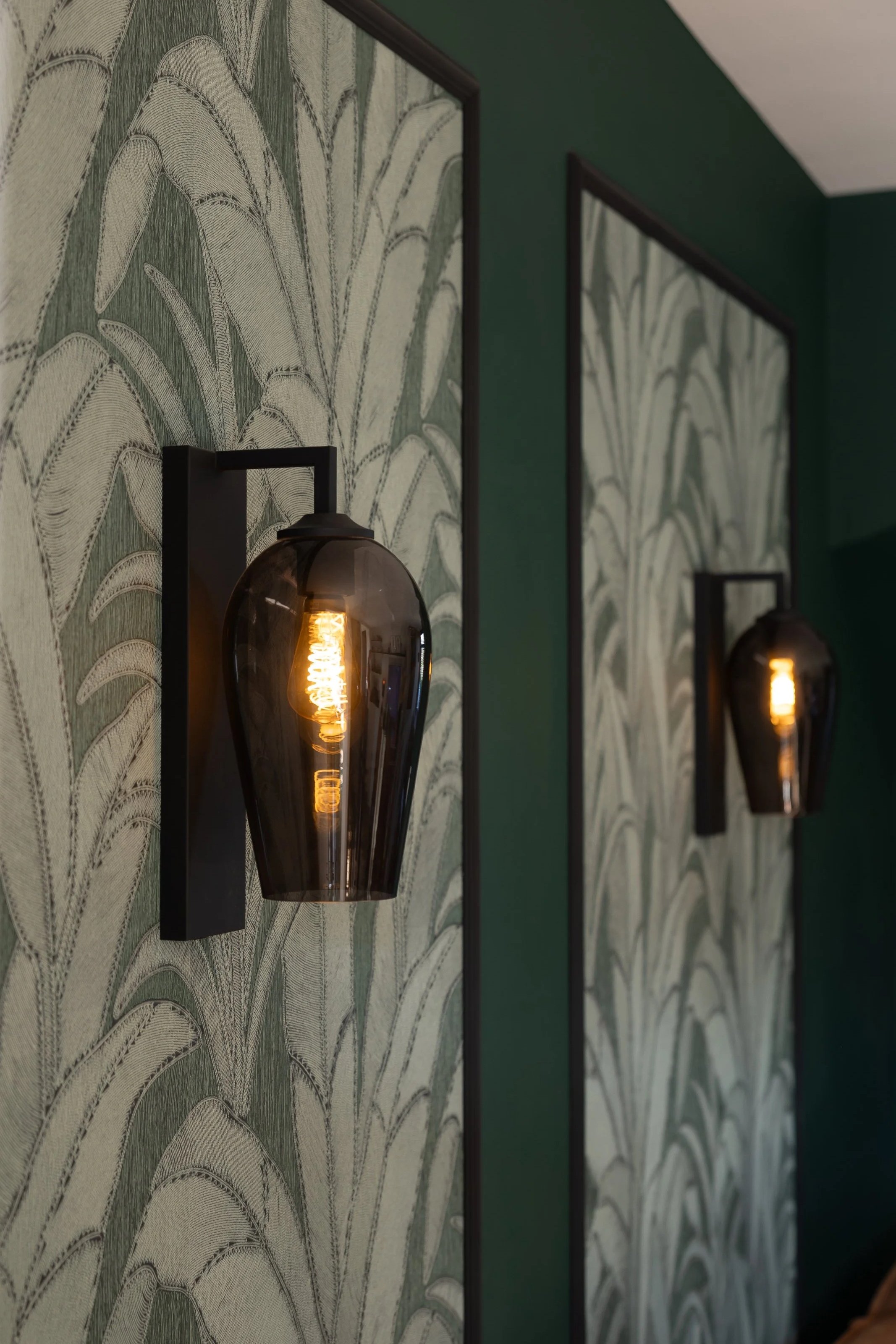 Voor deze woonkamerverbouwing kozen we ervoor om wandverlichting toe te voegen. Door het omlijste behang subtiel uit te lichten ontstaat er een mooi accent in de ruimte. De verlichting benadrukt de details van het ontwerp en zorgt tegelijkertijd voor een warme, sfeervolle uitstraling in de woonkamer.