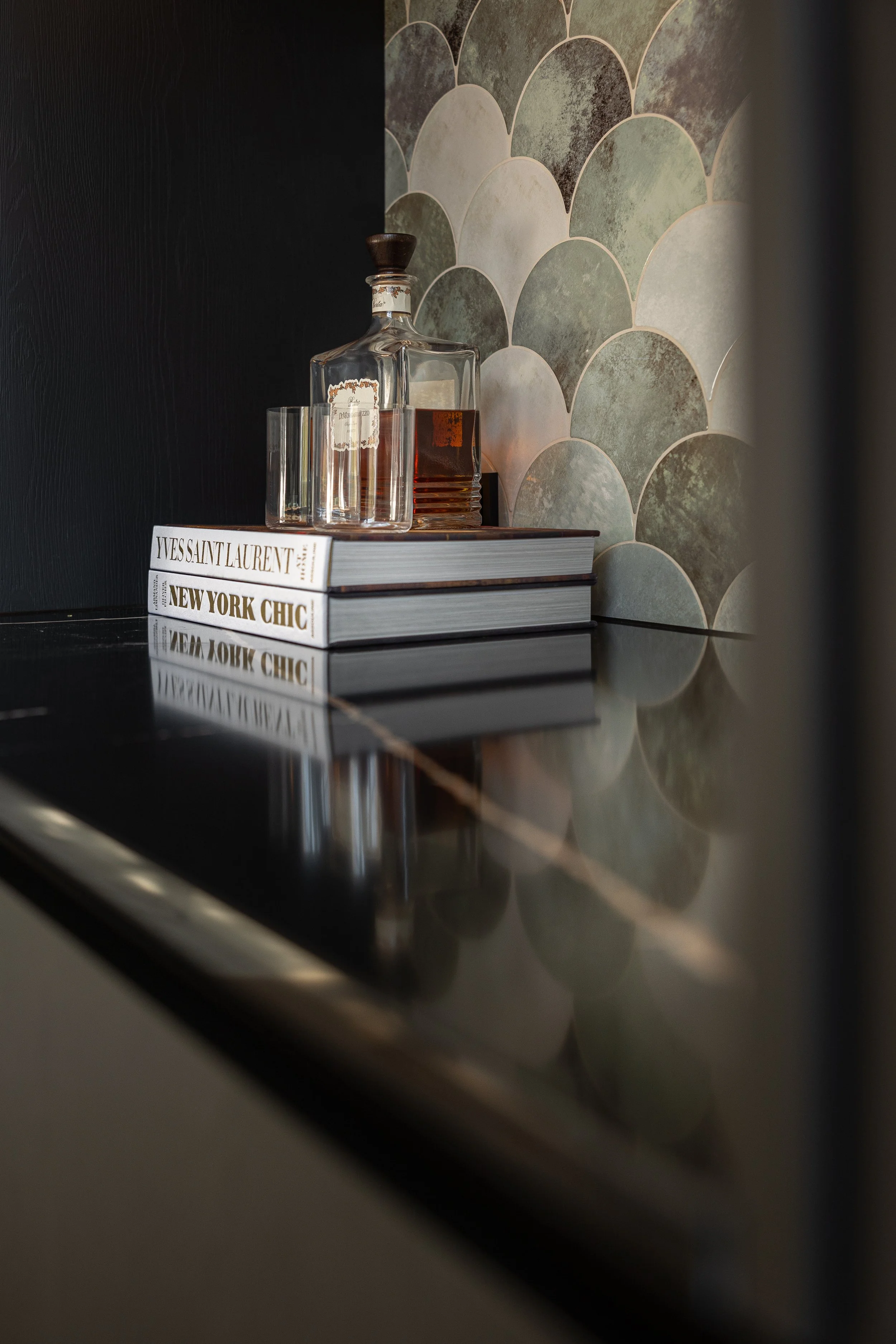 Voor dit specifieke project kreeg ik de kans om het volledige ontwerp op me te nemen. De opdrachtgever had duidelijk aangegeven een stijlvolle en elegante ambiance te willen. Met deze richtlijn in gedachten hebben we vrijwel elke wand bekleed met luxueuze wandbekleding, wat zorgt voor een intieme sfeer. Direct bij binnenkomst zijn de vele verschillende texturen al zichtbaar.