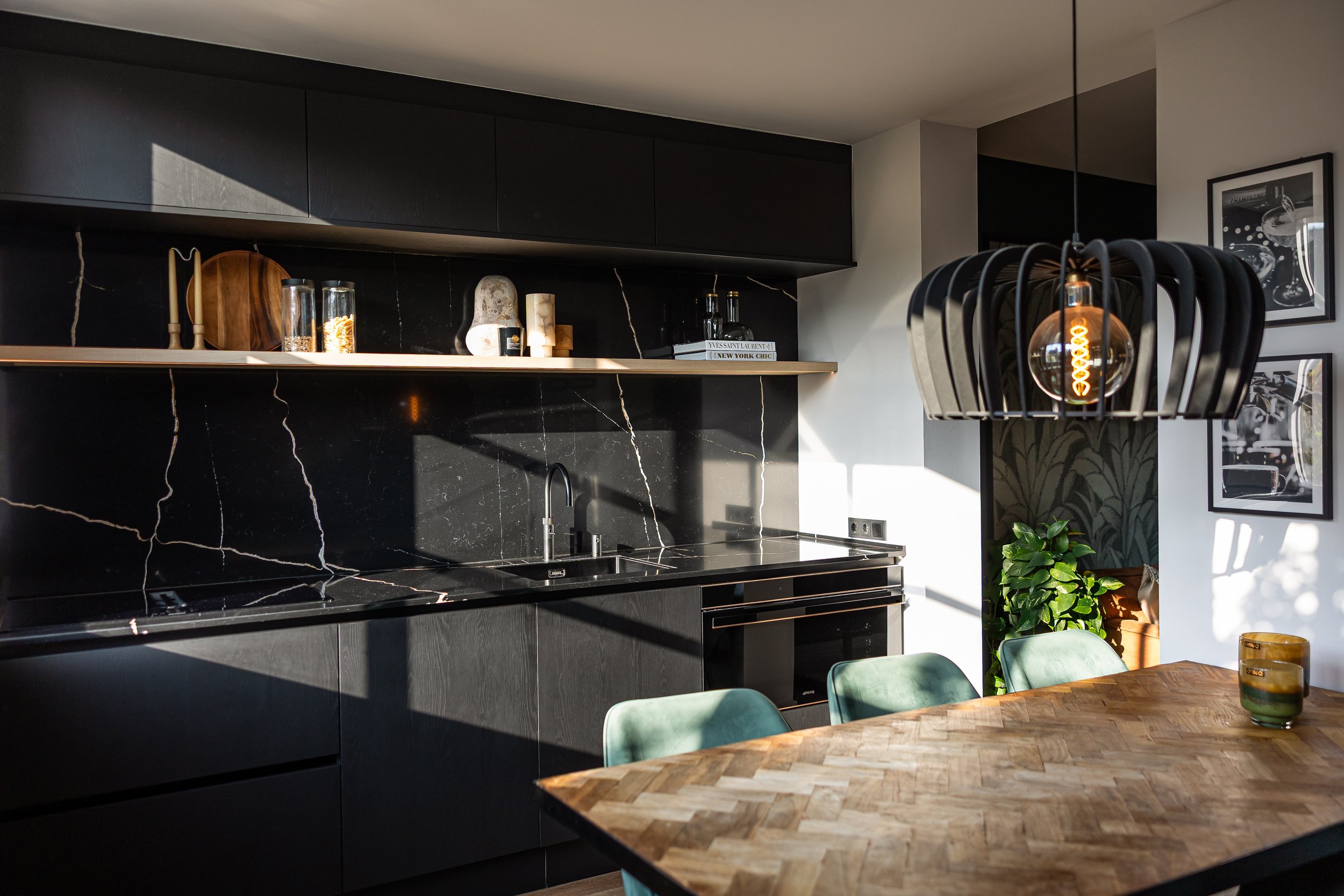 Het clusteren van deze goudkleurige hanglampen creëert niet alleen een visueel contrast met de diepe tinten van de keuken, maar voegt ook een gevoel van luxe en warmte toe. De schittering van het goud in combinatie met de reflectie van het hoogglans blad van de eettafel resulteert in een boeiend spel van licht en schaduw, waardoor een uitnodigende en gezellige sfeer ontstaat.