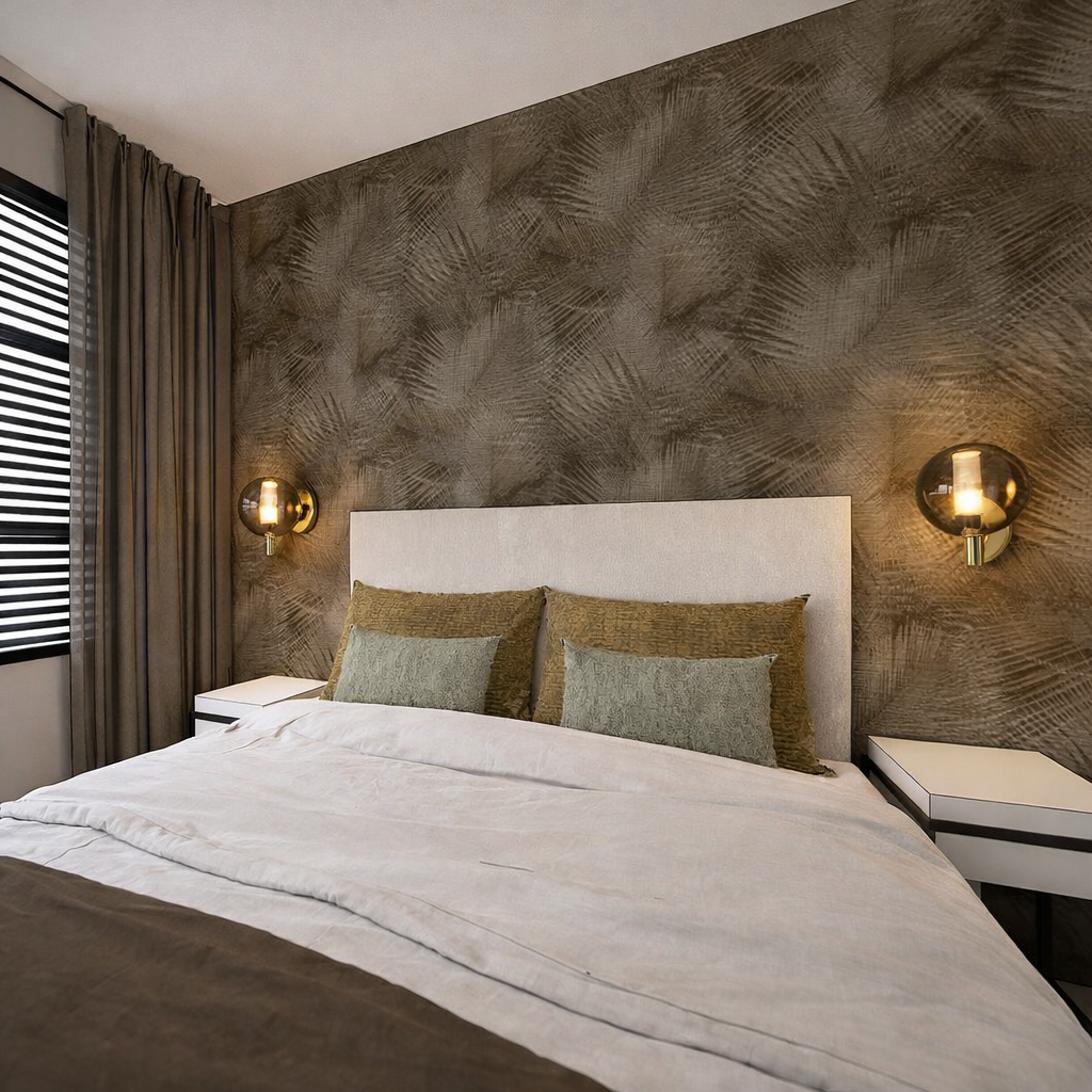 Als eye-catcher hebben we voor opvallende wandbekleding gekozen. De wandverlichting geeft hier een mooi accent aan en de aardse tinten zorgen voor een warme sfeer.